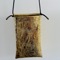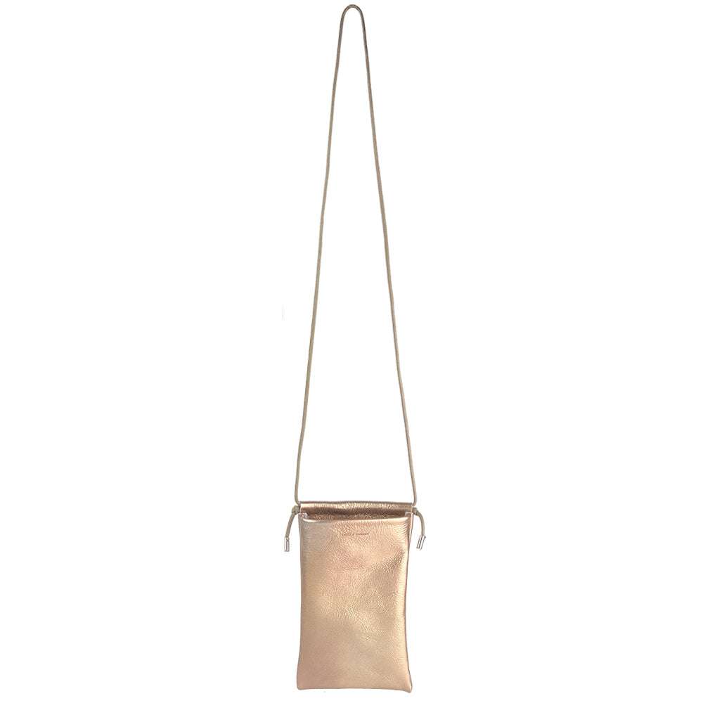 Sized to fit most phones and includes a card pocket on the exterior. Adjustable drawstring to fit to ones ideal length and can even be cinched and tied to wear around your waist!